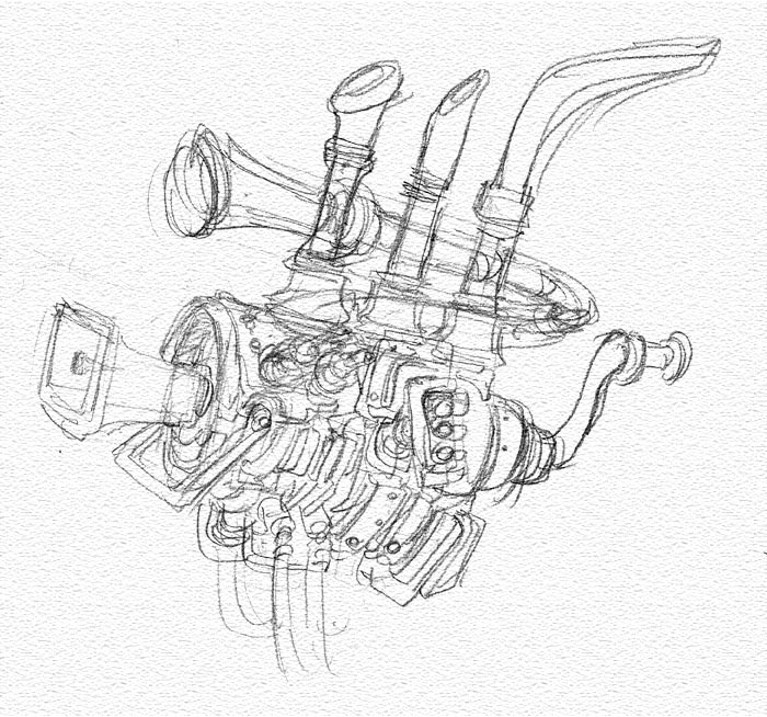 ゼロンの自作機械楽器のラフデザイン。ホルンなどの金管楽器とエンジンのマフラーを併せたような方向で考えていました。